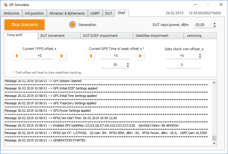 In the “Satellites impairment” tab, you can set the relative power, pseudorange offset and Doppler offset for each satellite.