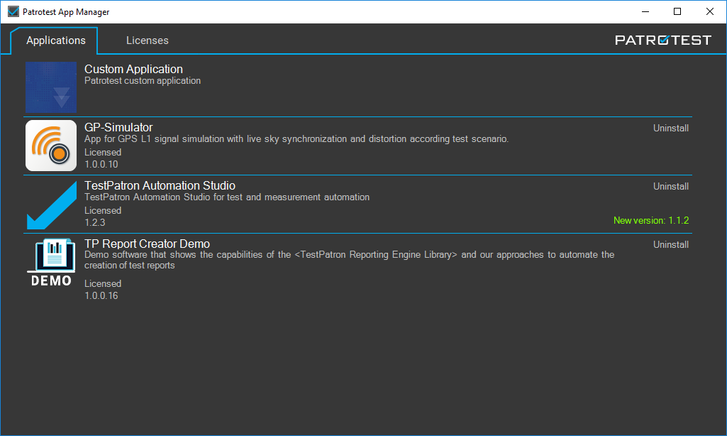 All software solutions produced by Patrotest and its divisions (GPS Patron, Spectrum Patron, and Test Patron) by default are equipped with Patrotest Application Manager. Patrotest Application Manager is the tool that is designed for effortless control of Patrotest's software solutions, license activation and management, and more.