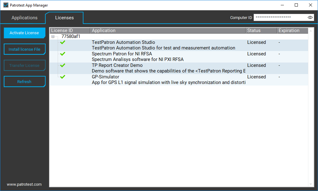In the “Licenses” tab of the Application Manager, you can activate your license(s), transfer licenses to other computer devices, and install license files.