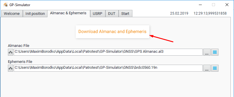 In the “Almanac & Ephemeris” tab, click on the “Download Almanac and Ephemeris” button to load files. NOTE: Internet connection is required.