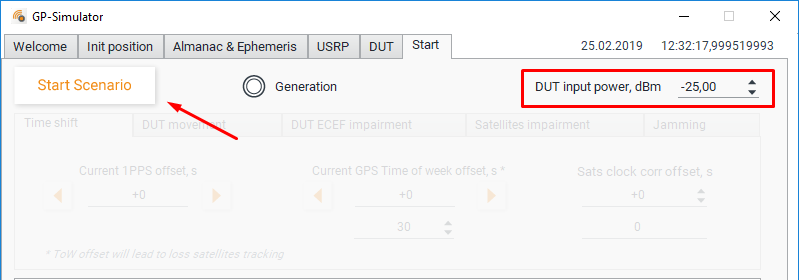 In the “Start” tab, set “DUT input power” to “-25 dBm” and then click on the “Start Scenario” button.