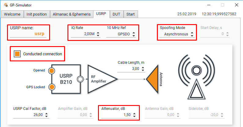 In the “USRP” tab, set the following: USRP name to “usrp,” 10 MHz Ref to “GPSDO,” “Spoofing Mode” to “Asynchronous,” and then check the “Conducted connection” box respectively.