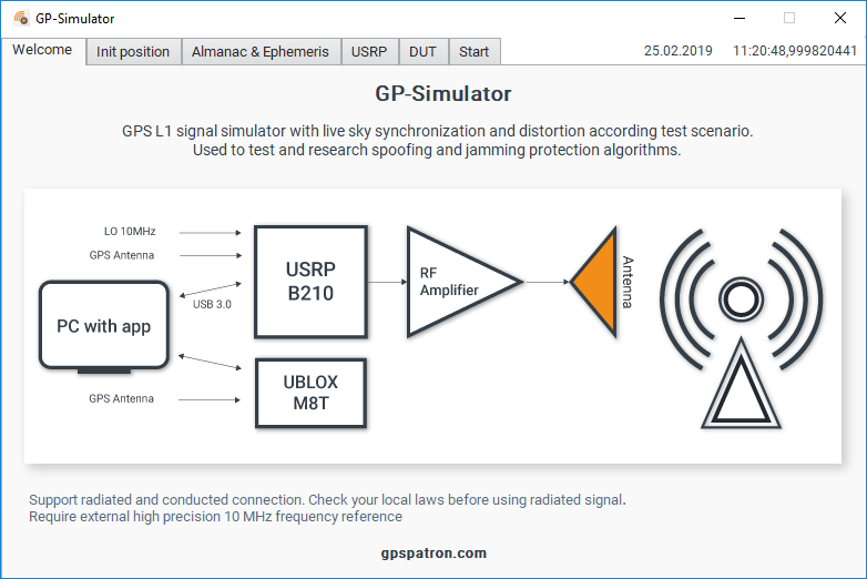 - Allows you to simulate a GPS L1 spoofer in synchronous and asynchronous modes for developing the corresponding protection methods and detecting potential vulnerabilities of the equipment to spoofing and jamming attacks;