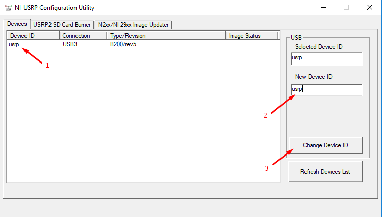 After that, find your USRP in the corresponding table/list and then set the name in the “New Device ID” field to “usrp” respectively. To save and apply the changes, click on the “Change Device ID” button.