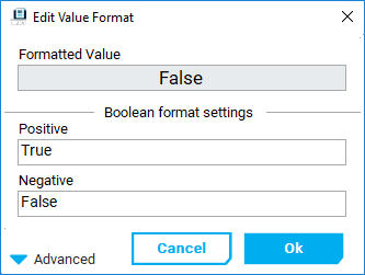 Double-click on the value for which you want to change the format and the format customization window will open. Boolean value format settings: